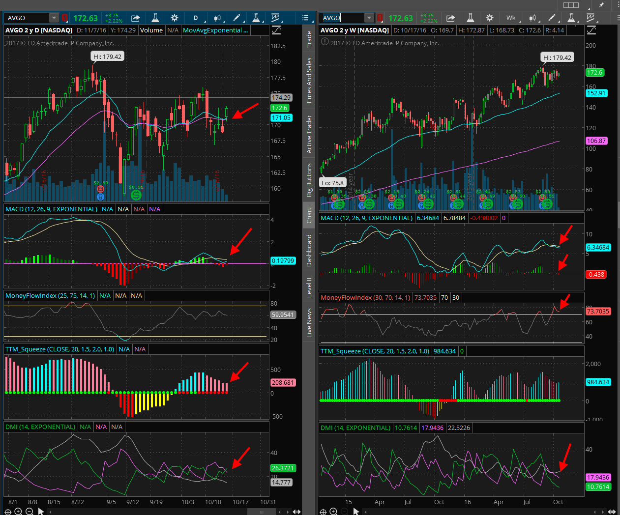 Using the AVGO below as an example, it’s clear that the stock is in an uptrend but three indicators show that it is in a slight pullback. This tells me that if I am wrong (I want to short it), I should get out ASAP because AVGO is still in an uptrend.