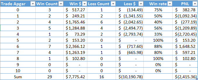 • The Profit and Loss (PNL) for these trades with Trade Apgar score below 4 points had negative PNLs.